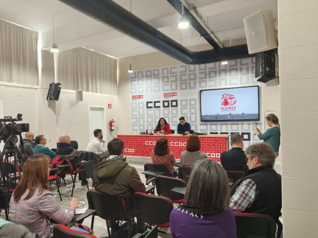 Durante la presentación de la ‘Alianza Contra el Odio’, la profesora de la UCLM, Marta Escribano Carrasco, junto al secretario general de CCOO Albacete, Paco Gómez Tornero, y representantes de las diferentes organizaciones que componen la plataforma; ha subrayado que la alianza nace como “contrapeso al odio, para proponer de forma conjunta espacios de diálogo, de encuentro intergeneracional, espacios que pongan en valor las luchas obreras, sociales y ciudadanas que durante años nos han dejado un Estado de Bienestar y una Democracia que ahora están denostados y en jaque”.